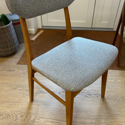 Både sæde og ryg er betrukket med slidstærkt blå/gråt møbelstof, der giver stolene et moderne og tidløst udtryk, samtidig med at de er behagelige at sidde på.