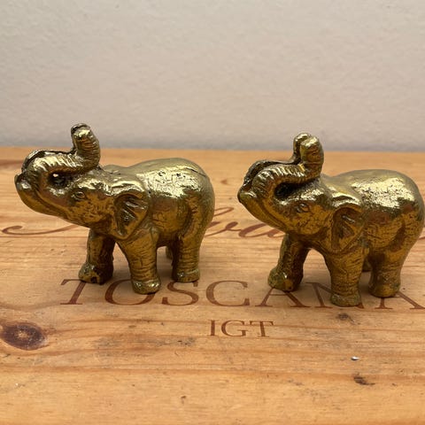 2 sorte elefanter med guldfarvet stødtænder - de er 6,5 og 9,5 cm høje.