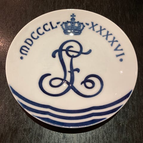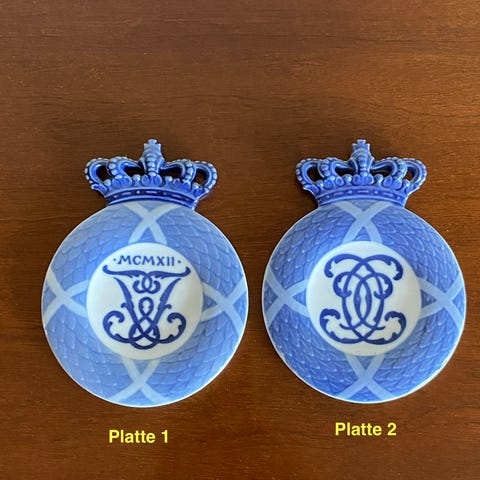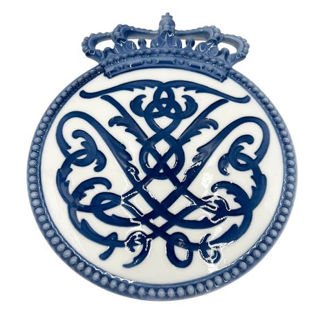 Kronet krans med spejlmonogram. Porcelæn (Underglasur).