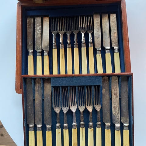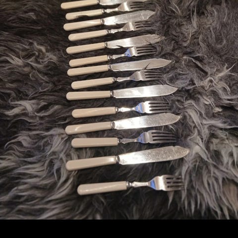 Gammelt fiskebestik i bakelit(?) og pletsølv til seks. Sættet har rigtig flot patina. Sælges kun samlet. Æsken med lille for følger med hvis man ønsker det.