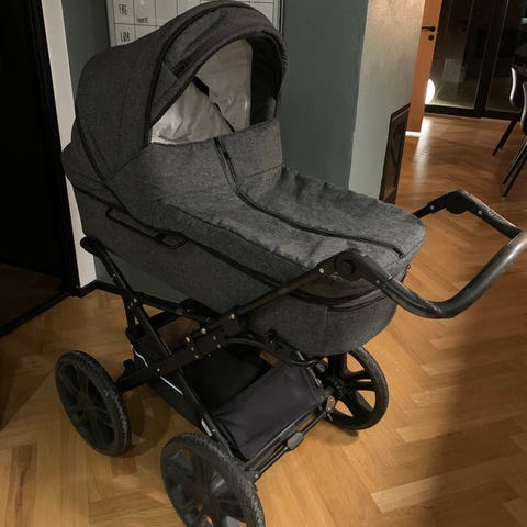 NORTH x Dream. Sort aluminium stel med SLE air punkterfri hjul. Barnevogns kasse i flot nordisk design, med bla lynlås i overlæder, solskærm og solsejl, ventilation og indbygget lygte. Flot melange med diskrete reflekser. Vognen er meget kompakt og kan være i selv de helt små bybiler.