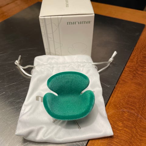 Fritz Hansen Minimi The Egg miniature stol i gul farve. Modellen er en detaljeret miniatureudgave af den ikoniske Ægget stol, fremstillet i stof med metalstel. Leveres med original æske, pose og dokumentation.