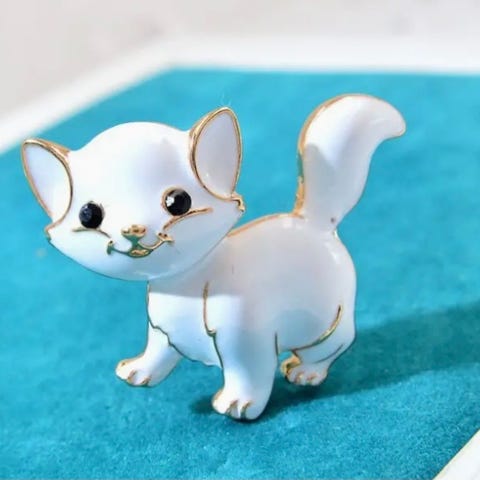 Forgyldt broche med et knaldrødt hjerte og en sort kat, der slænger sig ovenpå. Den røde og sorte emalje er meget flot, MEN PGA “BOBLER” I DEN RØDE EMALJE, SÆLGES BROCHEN TIL BARE 20 KR. Brochen måler 4×5 cm