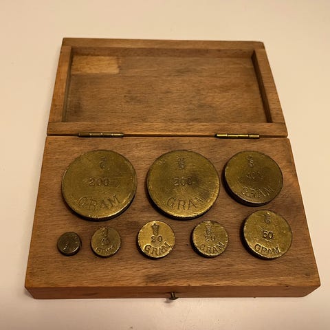 Dette er et sæt antikke vægtlodder i messing, der ligger i en trækasse.