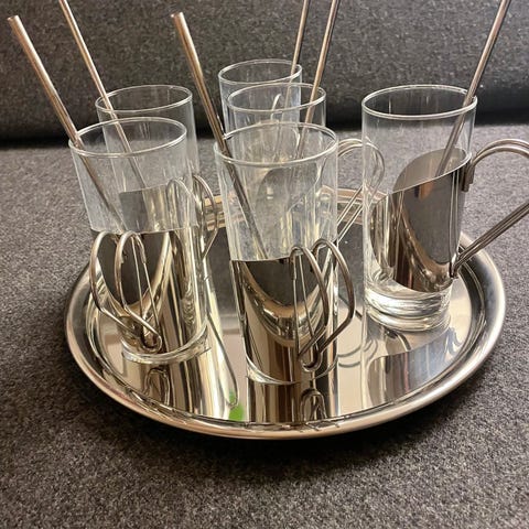 Gløgg glas. Glassene er klare og har tilhørende metalholdere i rustfrit stål. Sættet indeholder glas og holdere der kan bruges til servering af varme drikke som kaffe eller te - eller gløgg :-)