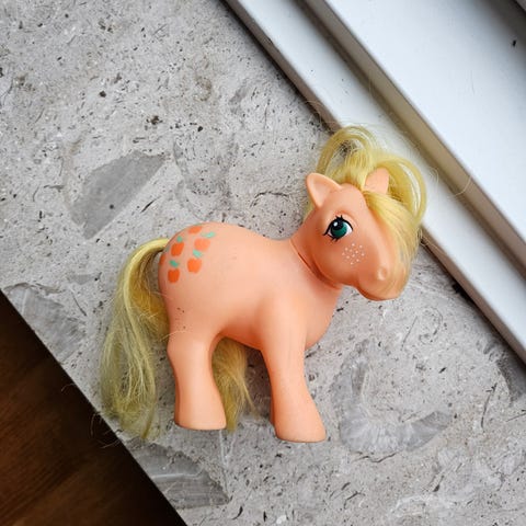 Vintage My Little Pony enhjørning fra 1983. Den har en regnbuefarvet manke og hale, og et lilla symbol på siden.