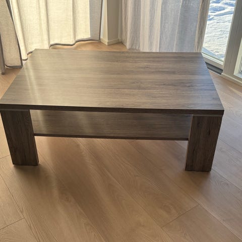 Sofabord med stel og bordplade i metal. Læder magasinholder