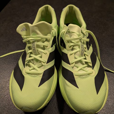 Adidas Adizero løbesko i hvid og sort farve. Skoene er i størrelse 43 1/3. Sælges da de er for små og er kun brugt på 5 løbeture siden julen 2025.
