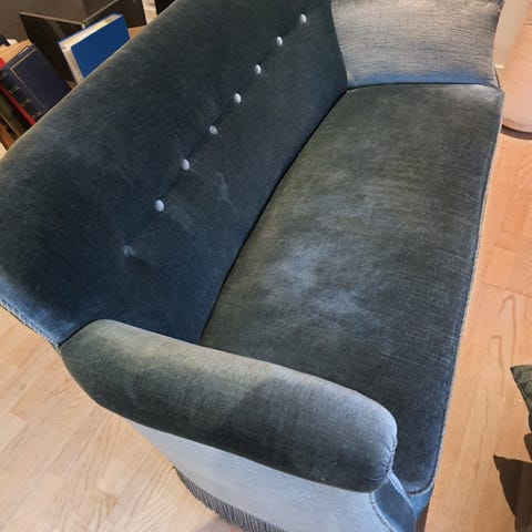 Stilen og farven er til at få øje på, siddekomfort er god, flyttesalg, sælges pga manglende plads i ny lejlighed. Den er blød da det er velouren. Pude og tæppe i samme farver høre med i købet hvis det har interesse.