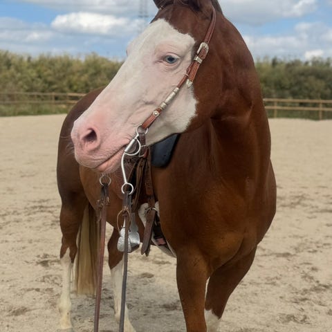 Sød kærlig hoppe. Kan håndteres af små børn. Respekterer hegn. Børn kan læsse hende. Savner en ny kærlig familie.