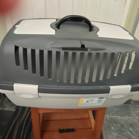 Transportkasse til kæledyr i gul farve med håndtag og låge med gitter. Designet til sikker transport af små kæledyr.