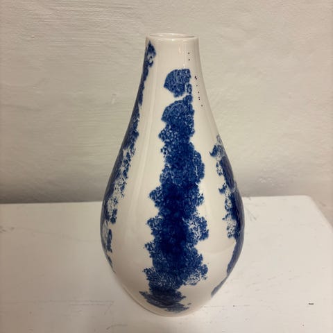 Dekorativ vase i blå og hvid porcelæn. Vasen er inspireret af kinesiske mønstre, har en rund form og er egnet til brug som dekorativ genstand eller til blomsterarrangementer.