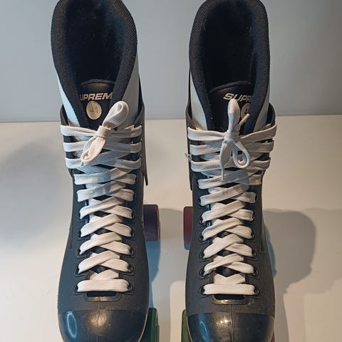 Turbo rulleskøjter i størrelse 38/39, sorte side by side. Skøjterne er designet til rulleskøjteløb og har klassisk snøresystem. De har fire hjul og en robust ramme, som sikrer stabilitet under brug.