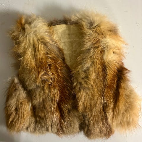 Meget klædelig og lidt speciel strikvest med aftagelig rævepels. Den kan knappes af.