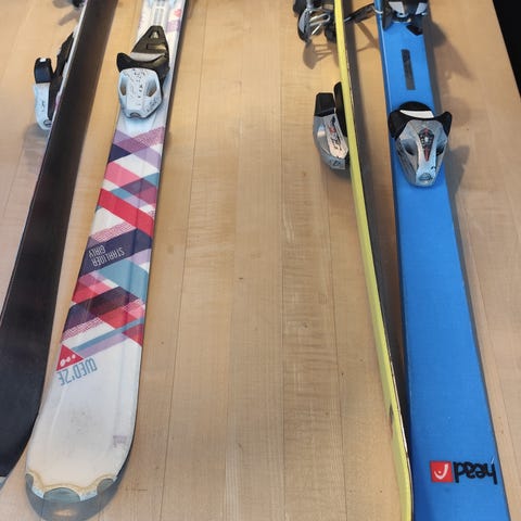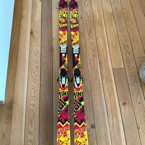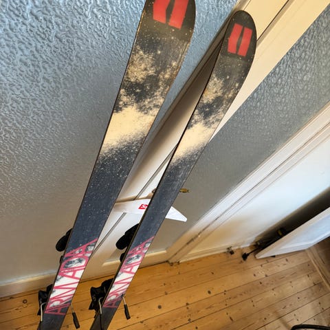 Armada Tantrum ski med monterede bindinger. Skiene har et mønstret design i sort, hvid og guld nuancer. De er velegnede til skiløb og fremstillet til at give stabilitet og kontrol på sne..