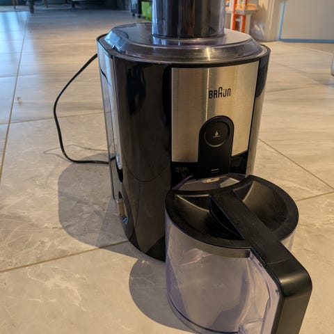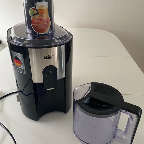 Braun Juicer i sort farve. Velegnet til at presse juice fra frugt og grøntsager. Har en enkel betjeningsknap og en beholder til opsamling af juice.