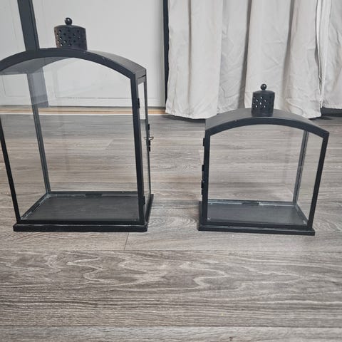 Sort metal lygtestativ med tre lanterner