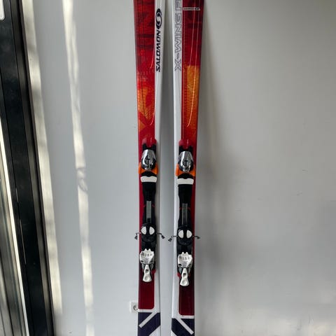 Salomon X-Wing 4 skis med bindingssystem. Skiene har en sort og rød farve og er designet til alpint skiløb. størrelser 172 cm