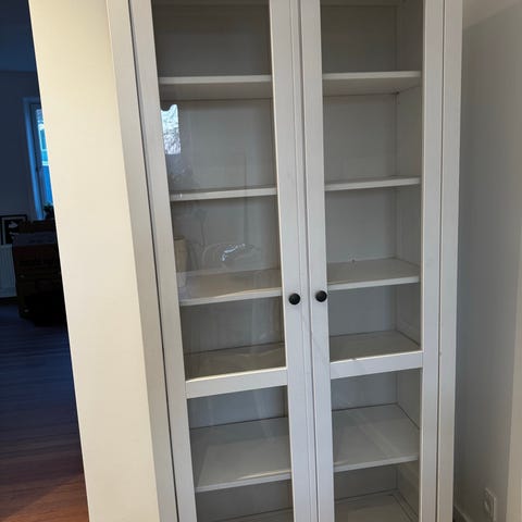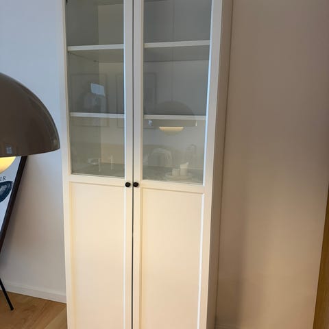 Ikea vitrineskab i rigtig god stand men der mangler noget af baldakinen både oppe og nede derfor den billige pris, der et et stk.( det til højre)