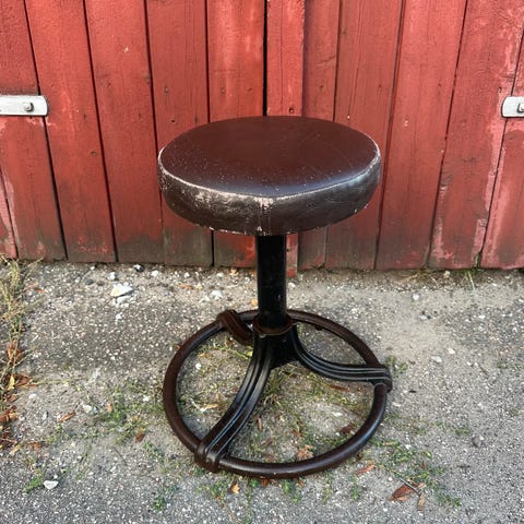 Firbenet skammel/taburet i mørkbejdset bøgetræ,betrukket med kraftig læder.