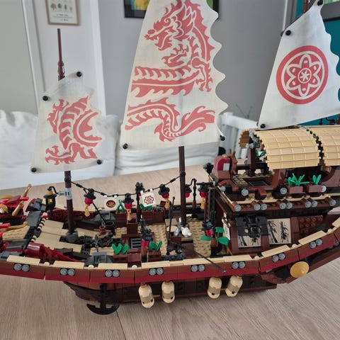 LEGO NINJAGO LEGO skib med cockpit, gennemsigtige blå vinduer og gule detaljer. Modellen inkluderer forskellige sektioner og elementer med fokus på et skibsdesign. Materialet er plast, og det er en del af LEGO NINJAGO-serien.