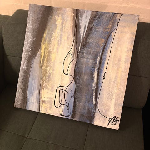Maleri med abstrakt motiv i ramme. Farverne inkluderer røde, orange og blå nuancer. Kvadratisk format med en ramme i sølvfarve.