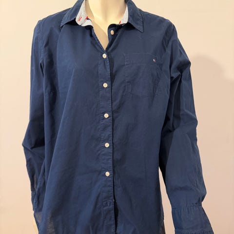 Dejlig blød skjorte, med knapper foran og ved ærmer, måler 66 cm (målt fra skulder og ned), bryst 46x2 cm (målt under armene), ærmer 77 cm (målt fra kraven)/52 cm (målt fra armhule), brugt men pæn og velholdt
