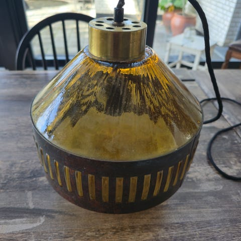 Pendel, Nanny Still McKinney fra RAAK, Gammel NANNY STILL lampe. Jeg vurderer at den er fra 1960'erne - 1970'erne, og at det er den model, som hedder "Brutalist". Overfladen er rust og indvendig er der glas.
