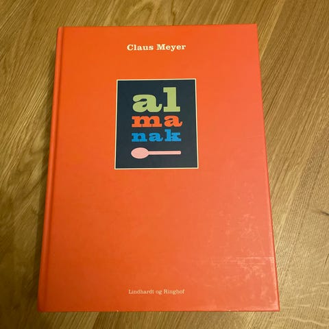 Claus Meyer Almanak kogebog med orange hardcover. Indeholder opskrifter og madrelateret indhold. Egnet til brug i køkkenet til madlavning og inspiration. Kan afhentes i Tullebølle, Svendborg, (evt Amager) eller sendes.