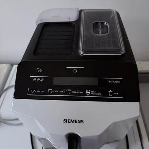 Siemens espressomaskine i sort farve. Maskinen har digitalt display og flere brygningsmuligheder til espresso og kaffevarianter. Designet til husholdningsbrug med brugervenlige funktioner.