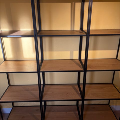 Har to af denne reol som er af sort metal ramme og træ hylder!