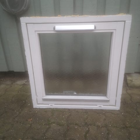 Badeværelsesvindue med glas og hvid ramme. Vinduet er udført i træ og har en håndtag til åbning. Passer til brug i rum hvor der ønskes indblikssikring samtidig med naturligt lys.