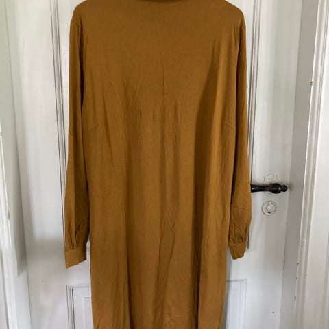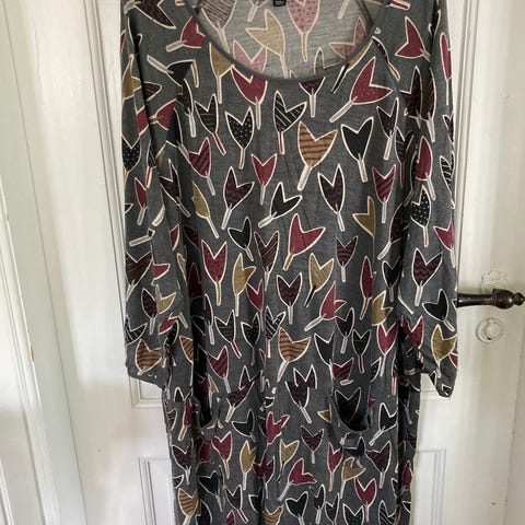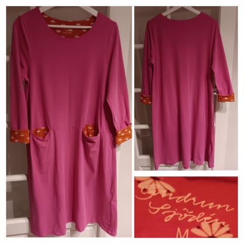 Gudrun Sjödén kjole S. Næsten som ny. 100% viscose jersey, falder godt. Længde 93cm. Bryst 45cm. Hofte 50cm. Nederst 62cm. Ærme indersøm35cm. 2 lommer i sidesømmen. Læg midt for. Vejer 275g.
