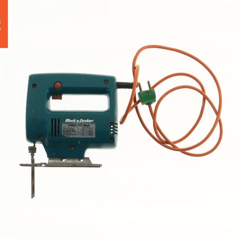 Black & Decker stiksav med elektrisk drift. Maskinen har et håndtag med gummigreb og en metalplade under savklingen. Strømforsyning sker via ledning med stik. Velegnet til savning af forskellige materialer.