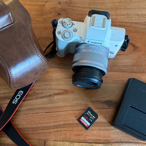 Sælger mit Canon EOS M50 Mark II kamera i sort med 15-45 mm IS STM objektiv.
