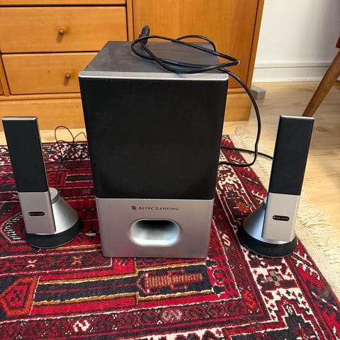 Super fine højtalere som fungerer upåklageligt men har små skrammer / brugsspor. Den ene tilsluttes computer med usb og den anden kobles på den første højtaler med aux.