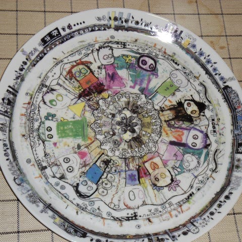 Rundt fad i porcelæn med forskellige motiver.
