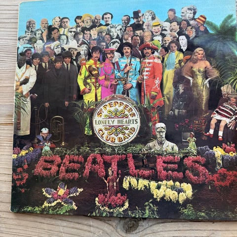 The Beatles Revolver vinylplade med sort vinyl og originalt cover med illustration af bandmedlemmerne. Udgivet af Parlophone. Afspilles ved 33 1/3 RPM.