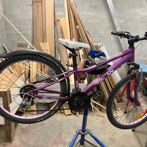 Børnecykel med 24" hjul, lilla farve, udstyret med både kurv og bagagebærer. Kurven har en flænge, se billede.