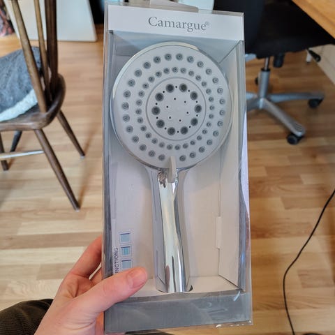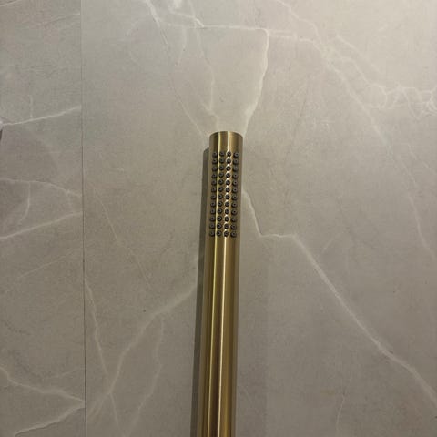 Håndbruser i messing finish med rund form og flere dyser. Designet til håndholdt brug i brusebad. Materialet er metal med en messingfarvet overflade.