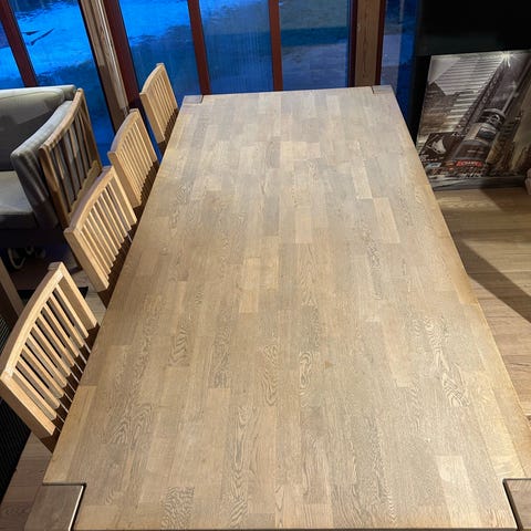Massivt spisebord med skuffe og 6 solide stole med høj ryg
