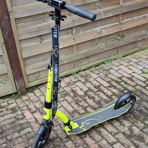 Blazer løbehjul i sort farve. Løbehjulet har et robust stel og håndtag i sort, designet til brug for børn og unge. Det har en kompakt størrelse, velegnet til transport og fritidsbrug.
