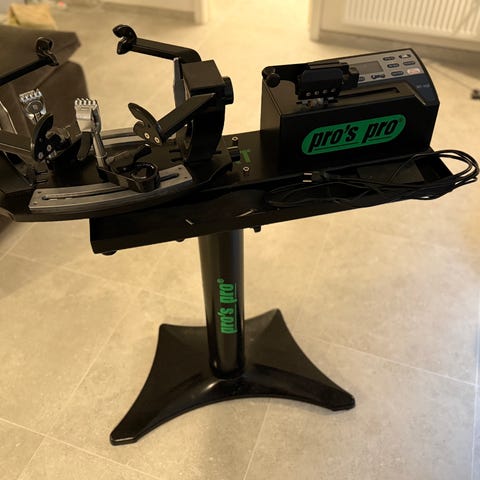 Pro's Pro tennis stringing machine med stativ og tilbehør. Maskinen er designet til opstramning og udskiftning af tennisstrenge. Leveres med værktøjer og tilbehør til opspænding af strenge.
