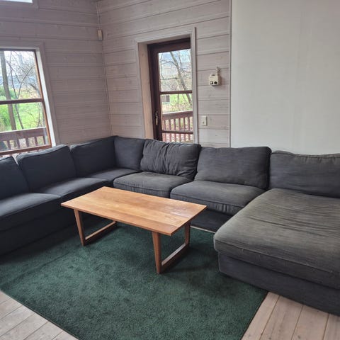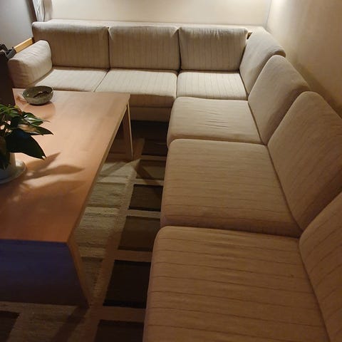 Orlando modulsofa gives væk. Stellet er skiftet til træmeder på nogle af modulerne. Det ene hjørnemodul har hul i stoffet.