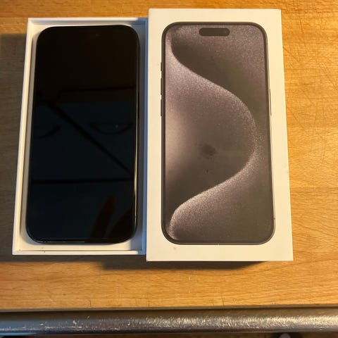 Apple iPhone 15 Pro Max med 256 GB i titanium. Bagsiden er ødelagt i det ene hjørne, men gør ikke noget andet end det - særligt hvis man vil bruge cover. Jeg har selv brugt den sådan i et halvt år uden cover uden det er blevet værre.