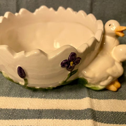 Fem håndlavede påskeæg i silkebånd. Jeg er i tvivl om de er udført i porcelæn eller keramik. Farven er off white og æggene er let glaserede. De er hule og delt i to “skaller”. Højden er 5 cm. Super pyntelige på en gren og alle frem i perfekt stand. Afhentes i Vanløse eller sendes - med yderste forsigtighed 😊