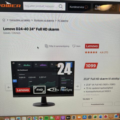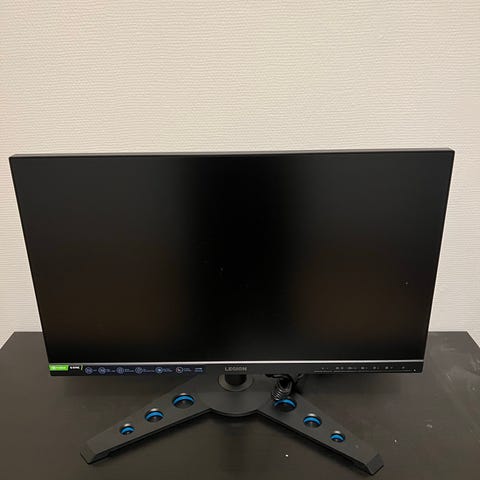 Lenovo Legion 24" skærm med sort kabinet og robust stander. Skærmen har en opløsning og funktioner til gaming og almindelig brug. Designet med fokus på stabilitet og brugervenlighed.