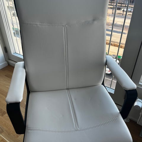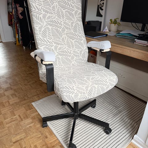 IKEA office chair in excellent condition with seat and backrest upholstered in grey fabric, and a black frame with wheels. The chair has adjustable height and is designed for use at a desk. Available for pickup 2-10 February 2026.