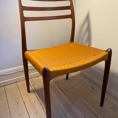 Spisestolen er produceret i delvis massiv teak, ryggen er af fineret teak