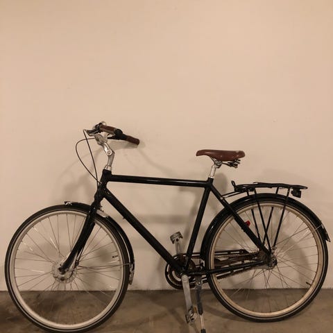 Den har nogle mærker og slag. Det næste der skal skiftes på den er bagdækket. Selve hjulet har det fint, det er dækket der er slidt, men den kører helt fint nu.